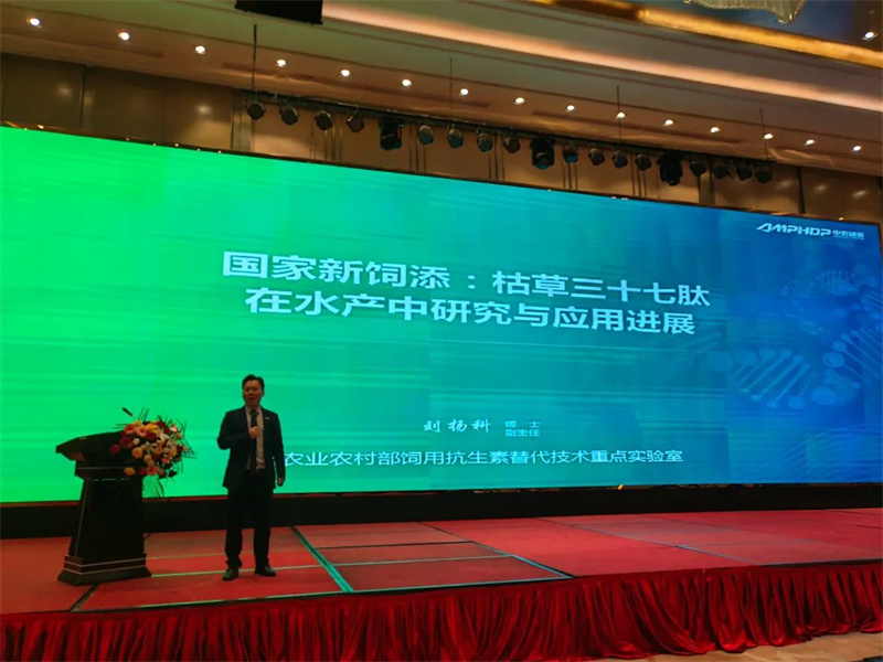 中農穎泰集團副總經理劉揚科博士出席會議,并做題為國家新飼添-枯草三十七肽的精彩報告,劉博士首先介紹了枯草三十七肽的研究歷程,及國家新飼添的申報歷程,集團數十年專注于抗菌肽的艱苦研發,終于獲得國家首個抗菌肽新飼添證書,開創了抗菌肽應用研發新紀元!劉博士詳細闡述了抗菌肽的作用機制、現場應用效果。在水產上,抗菌肽具有促進生長、修復腸道、提高免疫力增加成活率等作用,中農穎泰抗菌肽水產飼料產品成分明確、安全合法可檢測、效果顯著廣泛使用。