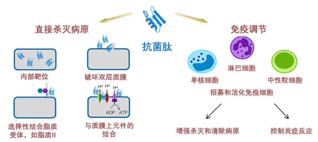 抗菌肽是一類具有抗感染功能的生物活性肽,廣泛分布于生物體內,是生物體先天性免疫防御系統組成部分,具有抗菌、抗病毒、抗腫瘤、維護免疫系統穩定的功效。大量研究表明,直接抑制或殺滅病原微生物和調節機體免疫功能是抗菌肽發揮抗感染作用的兩個主要途徑。而且,宿主細胞產生抗菌肽花費的時間和能量少于獲得性免疫所需的抗體,抗菌肽能比免疫球蛋白更快到達靶點,從而快速發揮抗感染作用。總之,在飼料禁抗、養殖減抗背景下,抗菌肽可有效代替抗生素,并通過增強動物免疫功能,提高動物抗病能力,保障養殖效益。