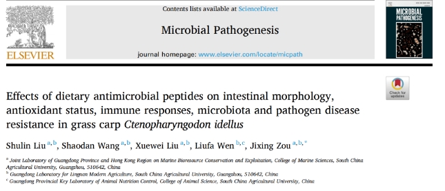 Shulin Liu,Shaodan Wang,Xuewei Liu, et al. Effects of dietary antimicrobial peptides on intestinal morphology, antioxidant status, immune responses, microbiota and pathogen disease resistance in grass carp Ctenopharyngodon idellus. Microbial Pathogenesis. 2022;165 (0):105386-105386.